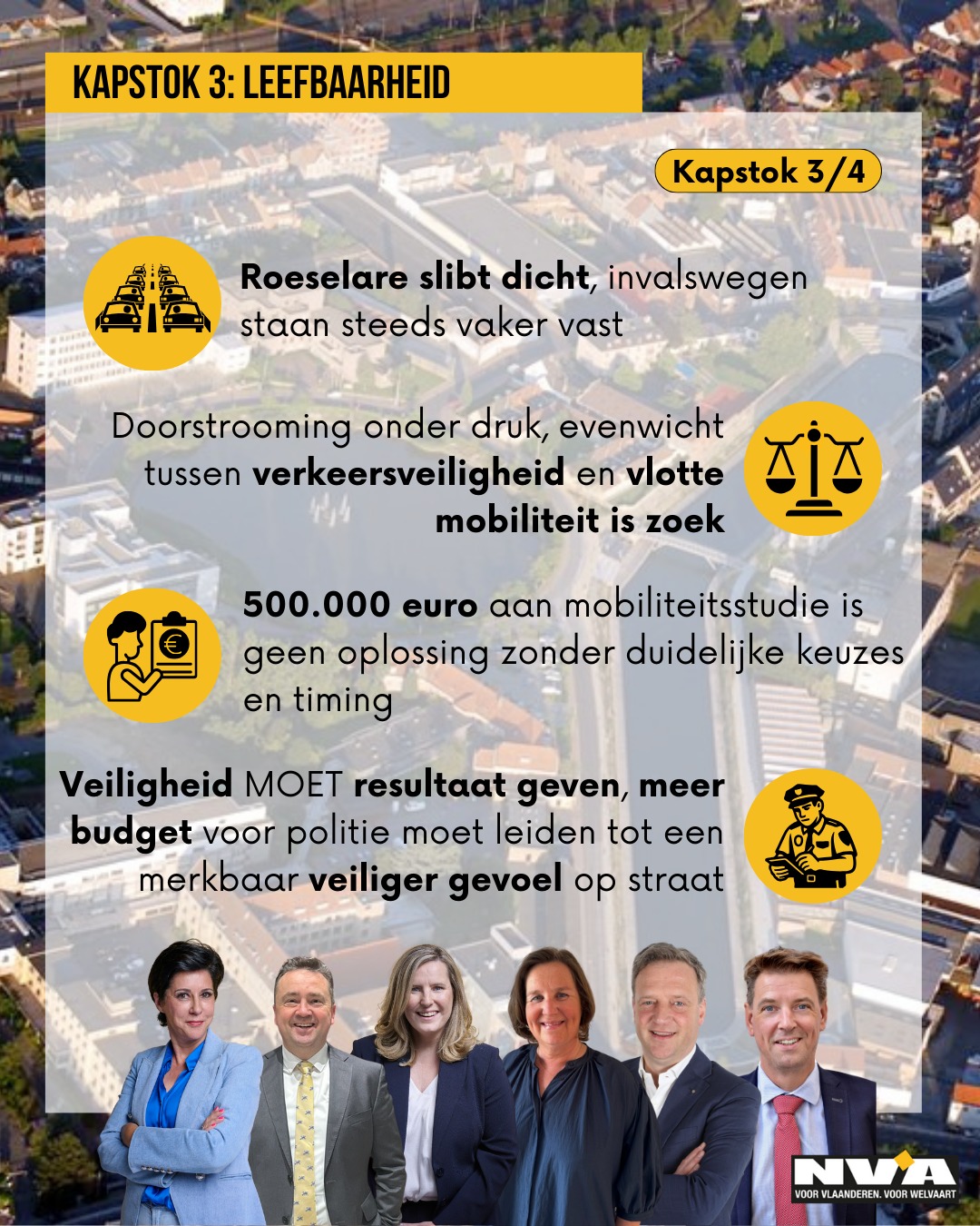 Met N-VA Roeselare blijven we pleiten voor een bereikbare stad en echte veiligheid, met duidelijke keuzes, meetbare resultaten en een beleid dat vooruitkijkt. Zo blijft Roeselare leefbaar, vandaag én morgen.